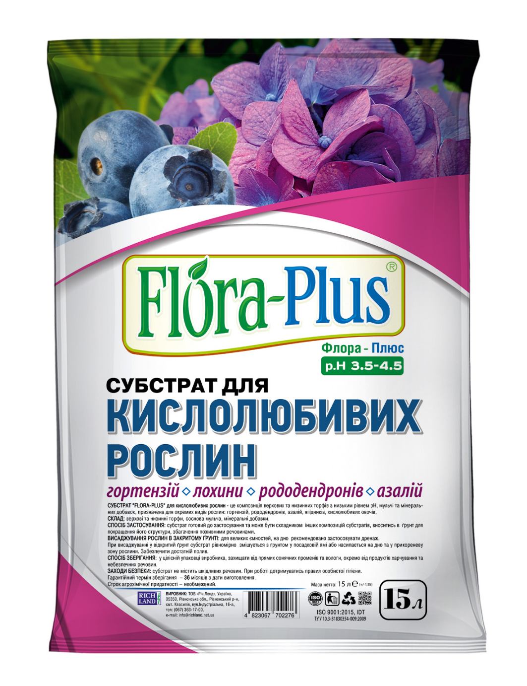 для вирощування кислолюбивих рослин, що потребують низького рівня pH (3,5-4,5) у відкритому і закритому грунті, а саме: гортензій, лохини, рододендронів, азалій.